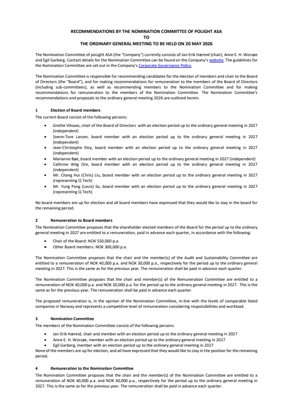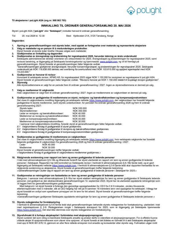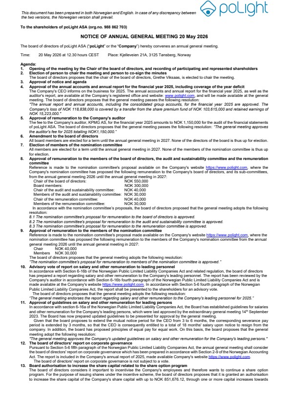 The shareholders of poLight ASA (“poLight” or the “Company”) are hereby summoned to the annual general meeting on Wednesday 20 May 2026 at 12.30 hours (CEST), which will take place at the company’s premises at Kjelleveien 21A, 3125 Tønsberg. The notice to the annual general meeting together with the attendance and proxy forms, is attached hereto.