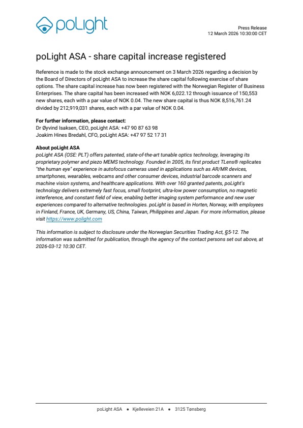 Reference is made to the stock exchange announcement on 3 March 2026 regarding a decision by the Board of Directors of poLight ASA to increase the share capital following exercise of share options. The share capital increase has now been registered with the Norwegian Register of Business Enterprises. The share capital has been increased with NOK 6,022.12 through issuance of 150,553 new shares, each with a par value of NOK 0.04. The new share capital is thus NOK 8,516,761.24 divided by 212,919,031 shares, each with a par value of NOK 0.04.